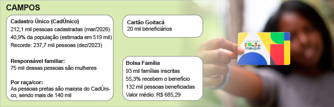 Em dezembro de 2023, Campos atingiu o recorde de 237,7 mil pessoas inscritas no CadÚnico. Em março deste ano, o número era de 212,1 mil campistas, o equivalente a 40,9% da população, segundo estimativa do IBGE de 2025, que 519 mil habitantes no município. Hoje, Campos ocupa a 6ª posição no Estado do Rio em número absoluto de cadastrados.