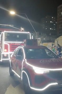 A noite de terça-feira (18) foi de encanto para moradores de Campos dos Goytacazes, que receberam a tradicional caravana de Natal da famosa fábrica de refrigerantes. A frota de caminhões iluminados percorreu diversas avenidas da cidade, levando música, personagens natalinos e o clima das festas de fim de ano. Uma delas foi a Avenida 28 de Março que teve a velocidade do trânsito reduzida durante a apresentação.