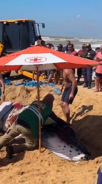 Um filhote de baleia-jubarte encalhou na manhã deste sábado (6), em Grussaí, São João da Barra, mobilizando moradores, Polícia Militar, Corpo de Bombeiros e Defesa Civil. Desde as primeiras horas do dia, dezenas de voluntários se uniram em uma força-tarefa para tentar manter o animal vivo até a maré encher.