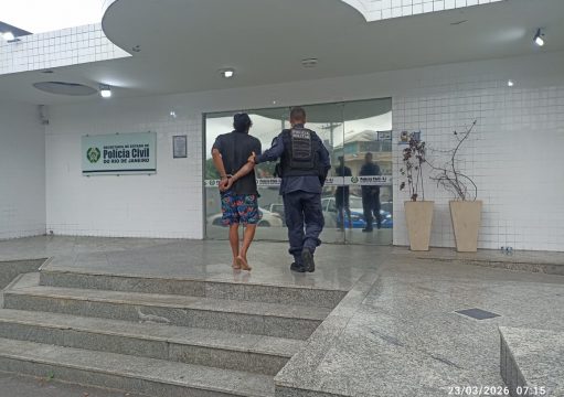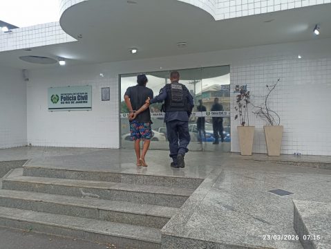 O suspeito foi algemado para evitar tentativa de fuga e encaminhado para a delegacia, onde o caso foi registrado.