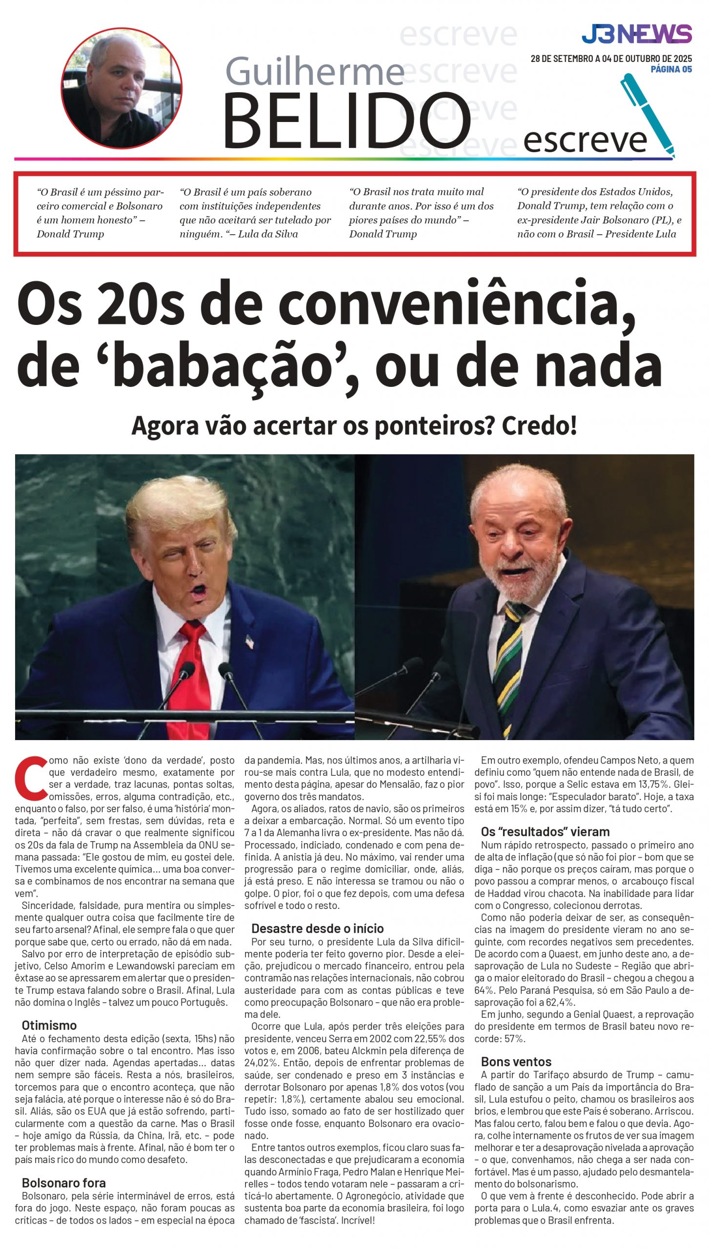 Até o fechamento desta edição (sexta, 15hs) não havia confirmação sobre o tal encontro. Mas isso não quer dizer nada. Agendas apertadas as datas nem sempre são fáceis. Resta a nós, brasileiros, torcemos para que o encontro aconteça, que não seja falácia, até porque o interesse não é só do Brasil. Aliás, são os EUA que já estão sofrendo, particularmente com a questão da carne. Mas o Brasil – hoje amigo da Rússia, da China, Irã, etc. – pode ter problemas mais à frente. Afinal, não é bom ter o país mais rico do mundo como desafeto.