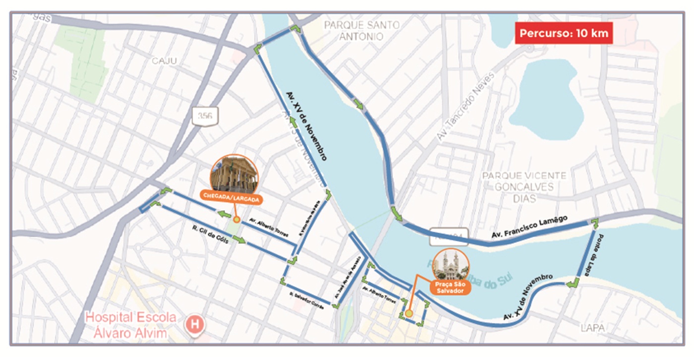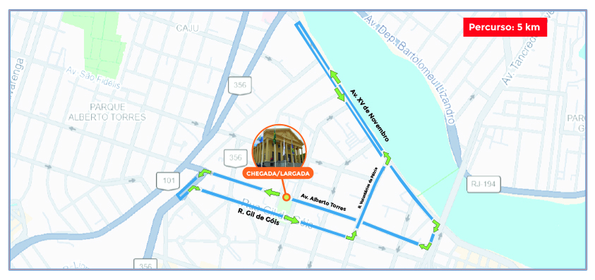 · 7h – Largada em frente à Câmara Municipal, na Av. Alberto Torres, em direção à Avenida 28 de março, contornando em frente à Secretaria de Educação para entrar na Rua Gil de Góis;