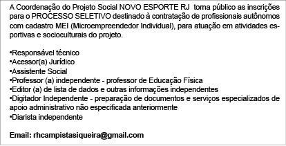 A Coordenação do Projeto Social NOVO ESPORTE RJ torna público as inscrições para o PROCESSO SELETIVO destinado à contratação de profissionais autônomos com cadastro MEI (Microempreendedor Individual), para atuação em atividades esportivas e socioculturais do projeto.