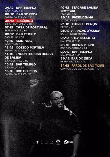 Tiee, um dos maiores nomes atuais do samba, será a atração do show da virada em Farol de São Tomé, no dia 31 de dezembro. O show será no palco principal da praia da cidade, na área da Marinha.